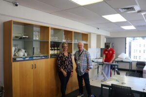 Ms Barnett and Mr Crockett in front of the area that used to teach service.