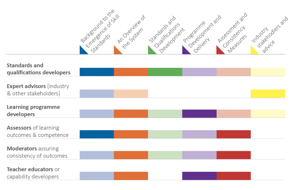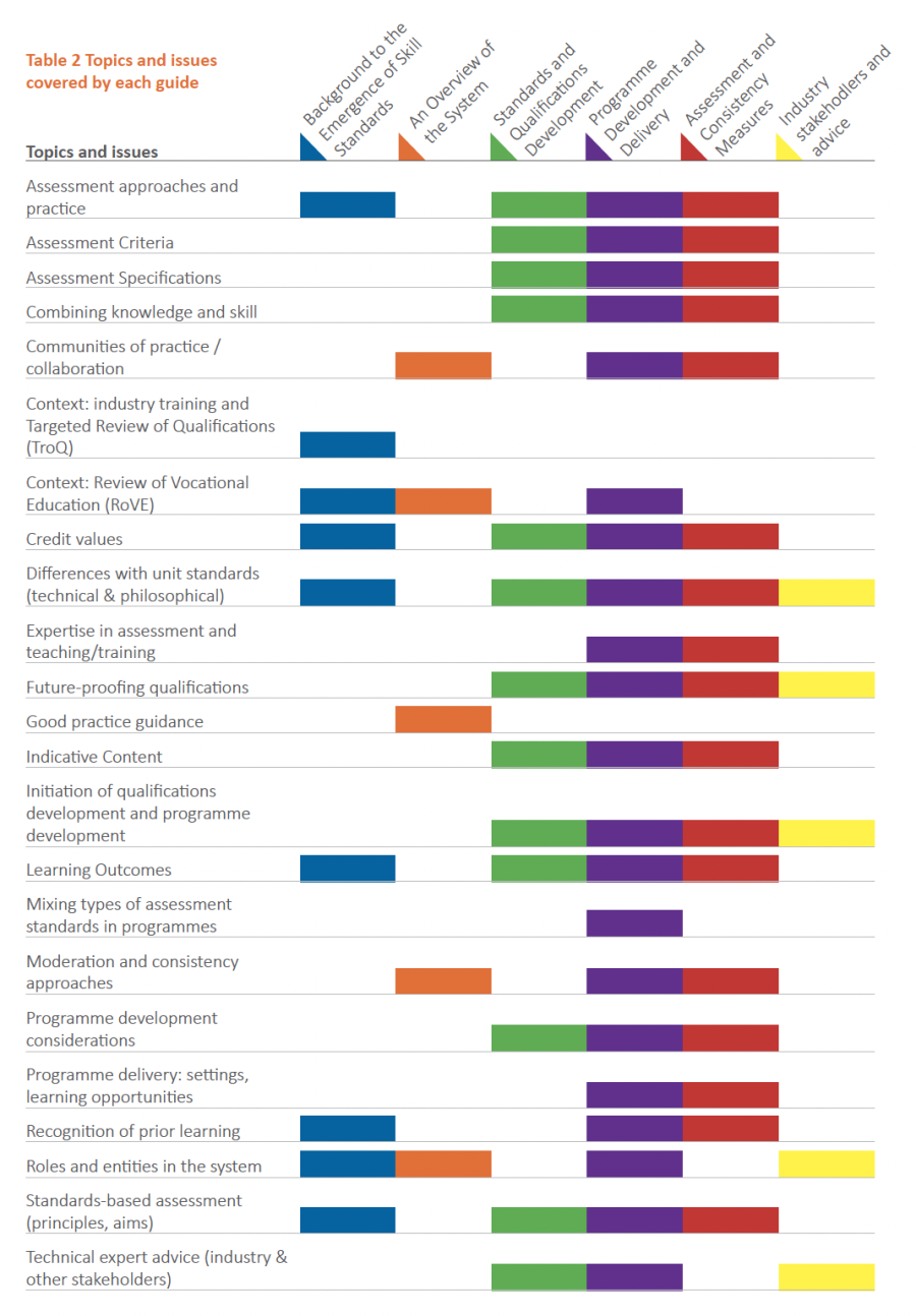 The audience for each guide is indicated by the title (e.g. the Assessment and Consistency Measures guide will be most relevant for assessors and moderators). However, a secondary audience for each guide is those who work ‘upstream’ or ‘downstream’ of the kind of work discussed. This is shown in the following table. Each guide in the set has been allocated a colour. That guide most relevant to a particular group is marked with that colour. A lighter shade of the same colour indicates relevance those working ‘upstream’ or ‘downstream’.